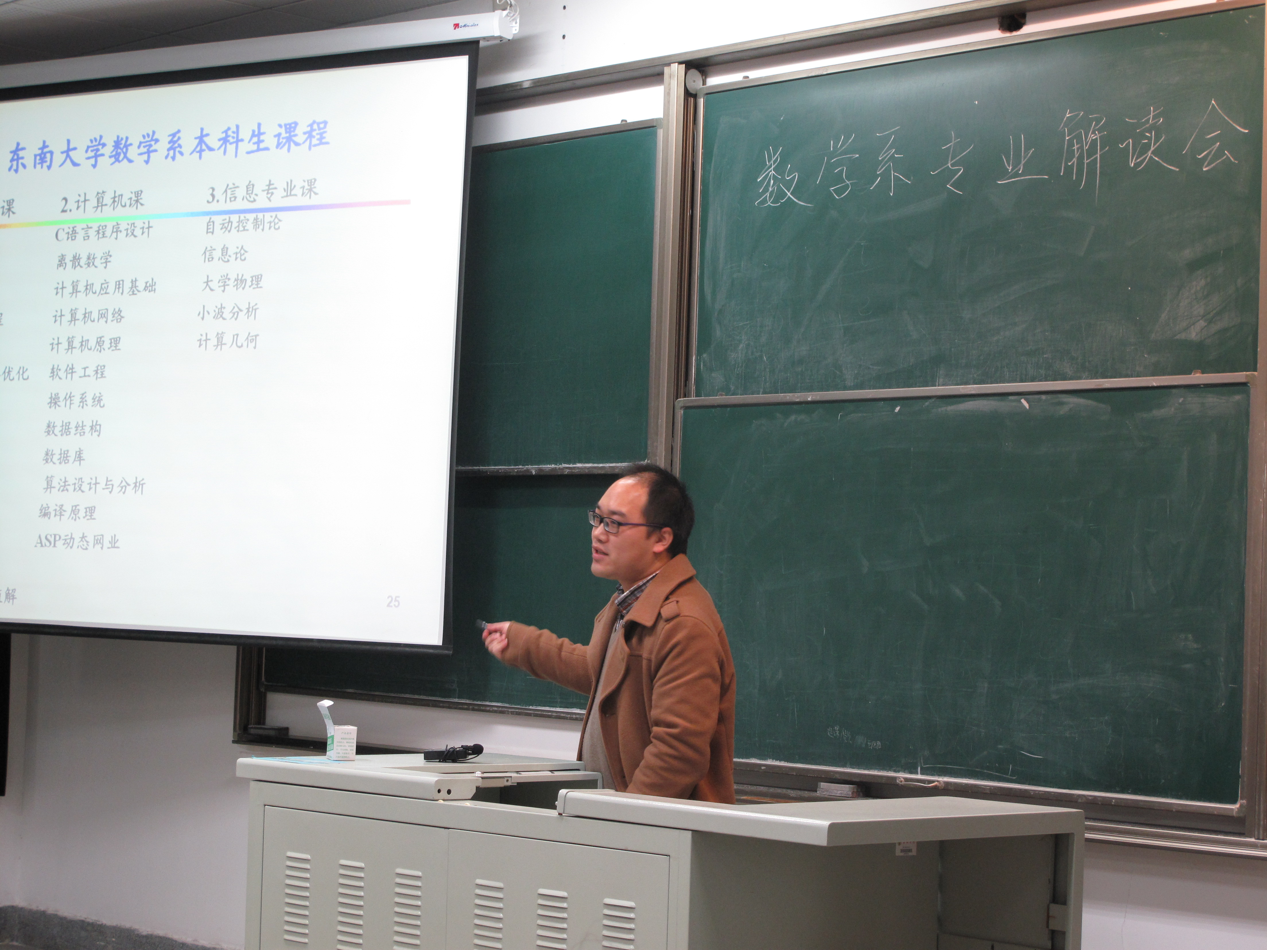 | 2014年12月26日中午在教二103,面向数学系大一新生的数学系专业解读会如期举行,数学系党委副书记曹海燕老师、副主任虞文武老师、统计学教研室副主任黄姓芳老师、信息与计算科学教研室殷翔老师和2014级各班班主任老师出席了本次大会。此次大会由数学系科协主办,邀请数学系三个专业教研室的相关老师面向2014级的新生进行各自专业的深入解读,使刚步入大学的数学系本科生对数学系及其三个专业有了详细的了解。 首先,虞文武老师就应数专业的相关情况做了详细的介绍。他以数学与网络科学为主题,从背景介绍,复杂网络协同控制,协同控制中的数学理论与方法,展望与思考四个方面进行了生动的汇报,阐述了应用数学是一门重要的学科。接下来,殷翔老师带领同学们了解了数学与计算科学。殷翔老师主要介绍了计算科学的特色及东大计算科学的优势,并对同学们的大学学习提出了殷切希望。最后,黄性芳老师为同学们介绍统计学的相关情况。除了对统计学,统计学的研究方向及课程安排进行介绍外,黄性芳老师强调了统计专业在在从事与统计、金融、管理等行业和继续深造方面的优势。 宣讲会过程中,老师们的讲解深入浅出,充分为学生考虑。同学们都认真聆听,细心思考。此次宣讲会对14级学生了解数学系各专业提供了极大的帮助,取得了圆满的成功。(田方正) |