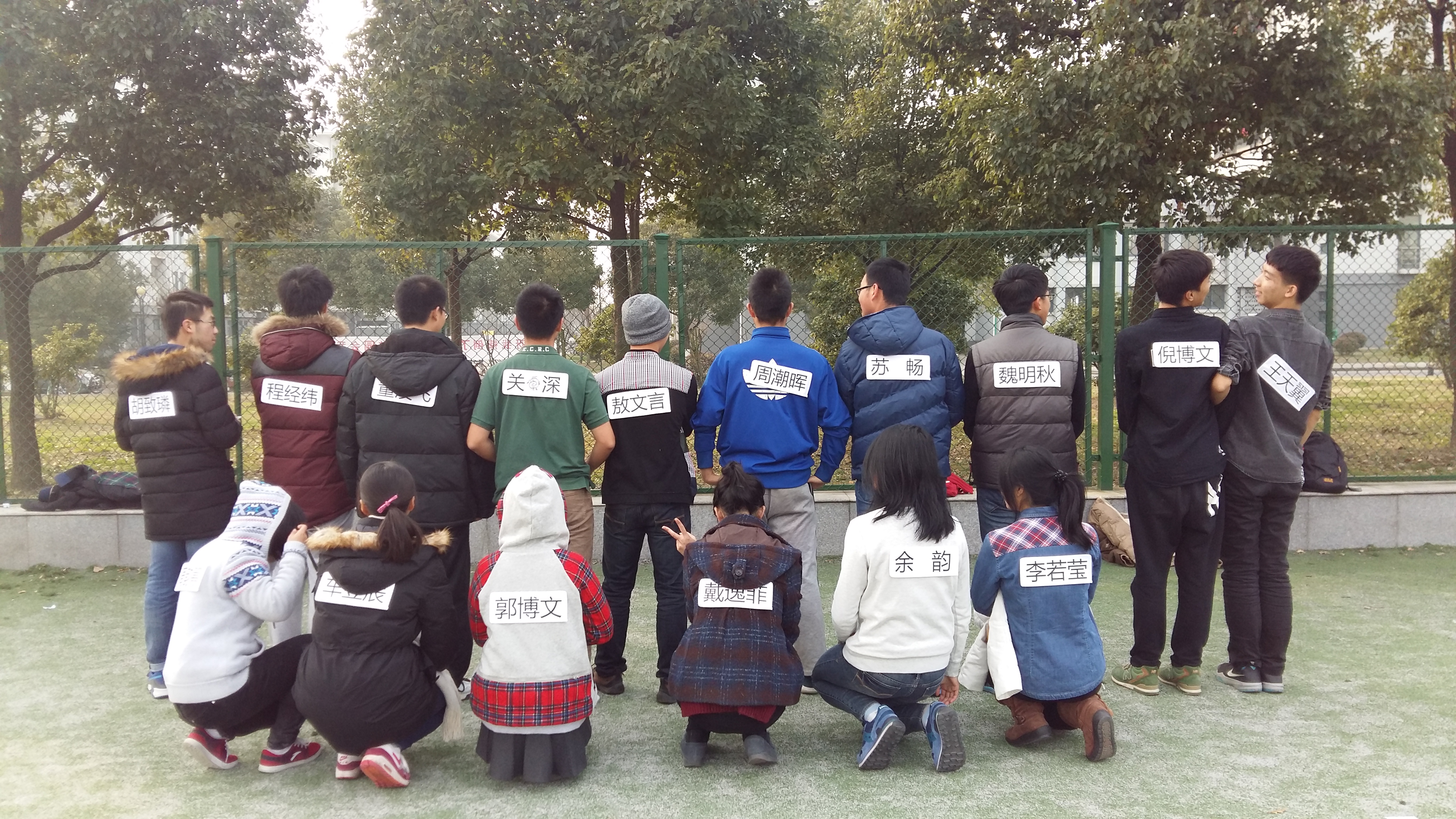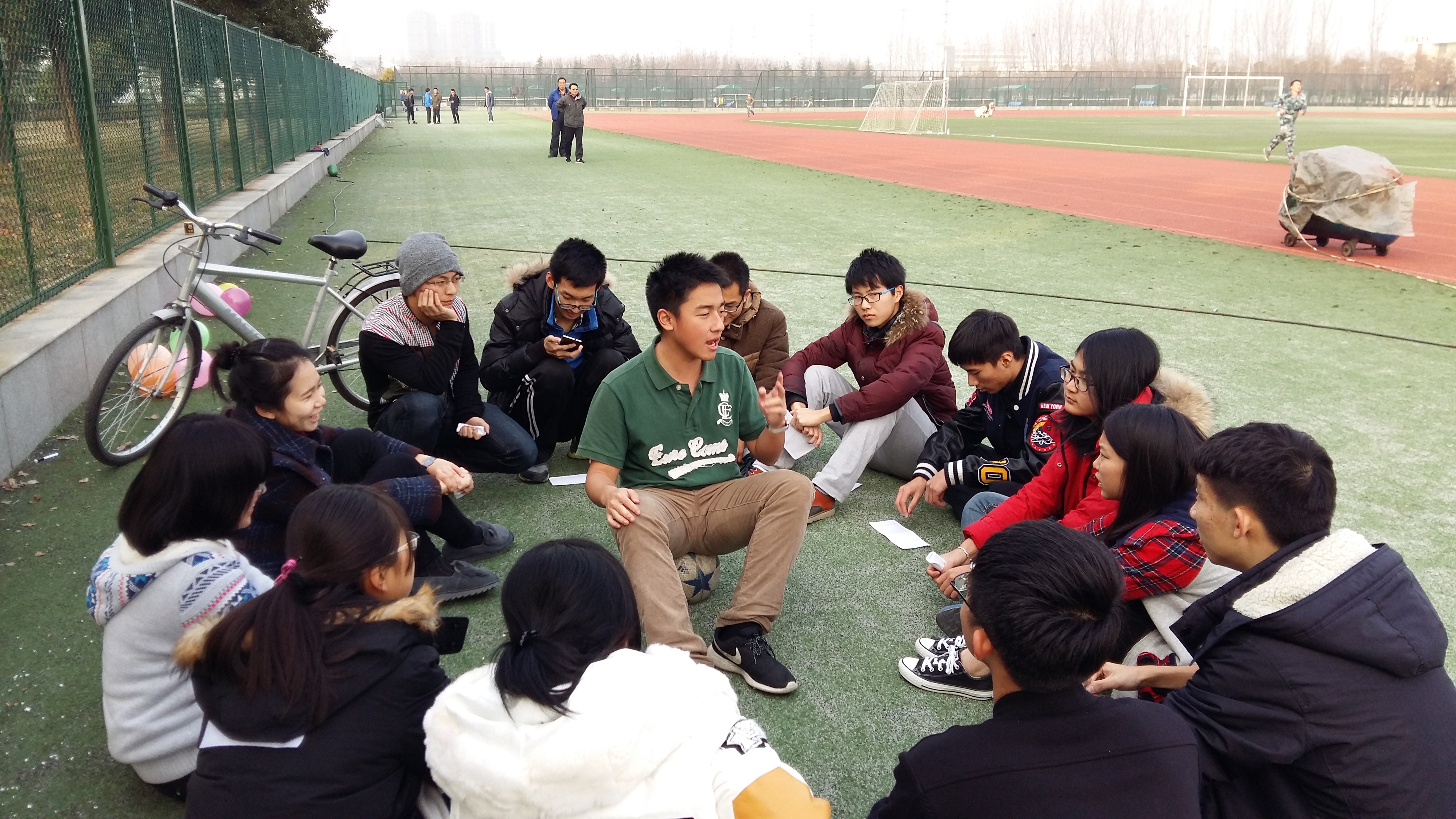 趣味运动会主要由踩气球,你做我猜和撕名牌三个活动组成。班委成员提早到达梅园体育场做前期准备,大家一边吹气球一边玩起了花样足球,用足球踢中气球者胜。听到这个新奇的想法,大家纷纷活跃起来,轮流守门,不亦乐乎。恰逢体育课的同学们在练习太极拳,成员们更是迫不及待加入其中,认真诠释着自己对以柔克刚的理解,争论着每一个动作和细节。