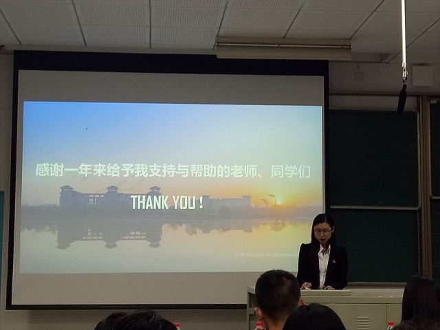 大会最后,蒋丽怡老师对本次大会进行总结。对上一届学生团委副书记和学生会主席团的工作表示高度肯定,对新一任团委副书记和学生会的工作提出了几点希望。最后,对组织本次会议的工作人员和出席本次会议的学生代表表示感谢。
