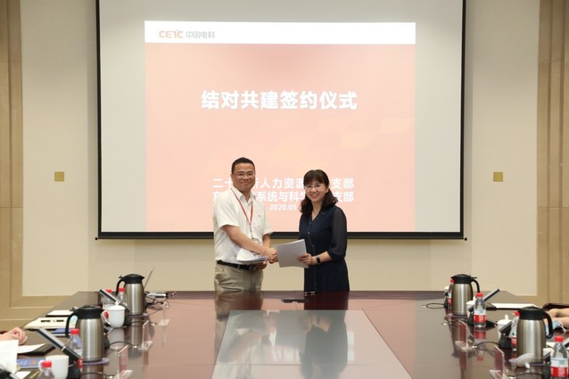 最后,芮平亮主任,钟辉书记分别代表中国电科集团第二十八所人力资源部党支部和快猫 系统与科学系党支部签署了结对共建合作协议。
