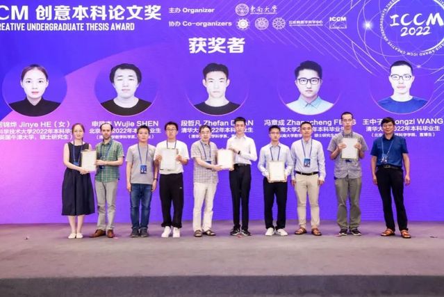 2022年7月31日至8月5日, 第九届世界华人数学家大会在南京召开。大会期间颁发了第六届ICCM毕业论文奖以及首届ICCM创意本科论文奖等奖项,在200余名国内外知名专家学者的见证下,快猫 学子朱诗勇和冯章成斩获佳绩,分别获得ICCM硕士毕业论文银奖和首届ICCM创意本科论文奖。