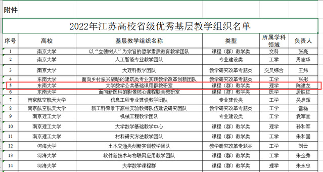 近日,江苏省教育厅发布了《省教育厅关于公布2022年江苏高校省级优秀基层教学组织名单的通知》。快猫 “大学数学公共基础课程群教研室”(负责人:陈建龙教授)获批2022年江苏高校省级优秀基层教学组织。