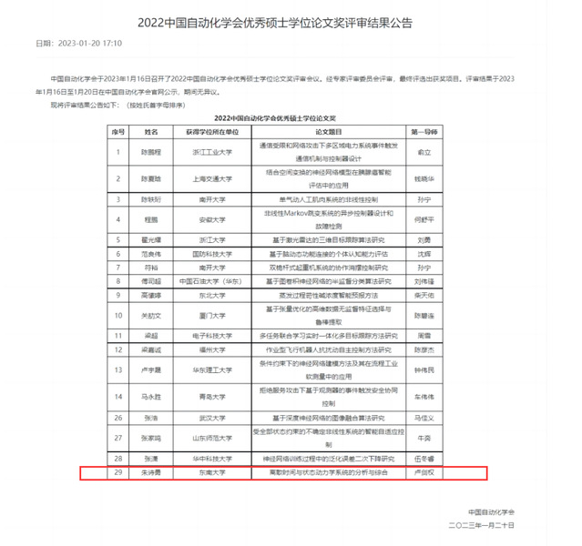 快猫 2021届硕士毕业生朱诗勇的学位论文《离散时间与状态动力学系统的分析与综合》(指导教师:卢剑权、曹进德)获2022年度中国自动化学会优秀硕士学位论文奖。