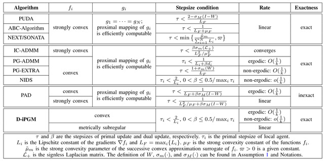此外,该算法允许近似求解近邻算子(无需任何局部通信),这有利于高效解决非光滑损失函数的近邻算子不存在解析解的情形。论文从理论层面严格证明了该算法的收敛性以及较温和条件下的线性收敛速率,与现有算法的对比结果如表1-1和1-2所示,算法在收敛条件、收敛速率、通信复杂度等方面都具备一定的优势。