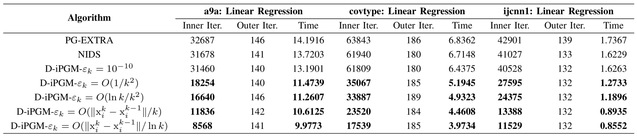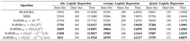 表2.实验结果:PG-EXTRA、NIDS、D-iPGM对于a9a、covtype、ijcnn1数据集上的带有一般LASSO正则器的线性和Logistic回归问题的性能表现比较