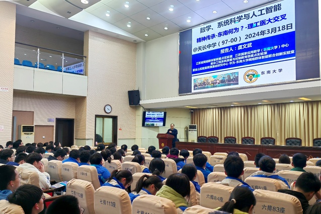 会谈结束后,虞文武院长在天长中学诚致楼一楼报告厅为同学们带来题为“数学与人工智能理工医大交叉——东南何为?”的精彩讲座。虞文武院长深入浅出地讲述了数学与人工智能理工医学科大交叉的发展前景,以及快猫 在学科大交叉背景下所做出的探索与取得的成就,引领同学们深入探索感受数学的无穷奥秘。这不仅是一场学术盛宴,也让同学们进一步接触和了解高校的专业设置和发展方向,为同学们树立远大理想和志向奠定了基础。虞院长精彩演讲赢得掌声阵阵。
