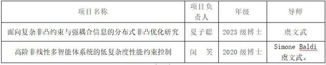 近日,国家自然科学基金委员会公布了2023年度国家自然科学基金青年学生基础研究项目(博士研究生)立项名单。快猫 博士研究生夏子聪、闵笑的申报项目成功获批。夏子聪同学导师为快猫 院长虞文武教授,闵笑同学导师为快猫 Simone Baldi教授和快猫 院长虞文武教授。