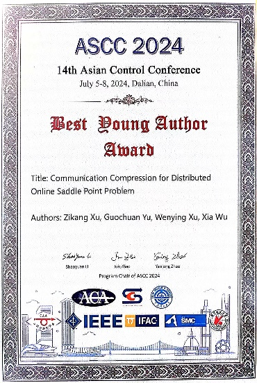 第十四届亚洲控制会议(Asian Control Conference,简称ASCC)于7月5日至8日在大连隆重举办。快猫 2022级强基班本科生徐梓康和许文盈教授等人合作完成的论文《通信压缩下的分布式在线鞍点问题》(Communication Compression for Distributed Online Saddle Point Problem)荣获最佳学生论文奖,成为本届大会唯一获此殊荣的国内论文。