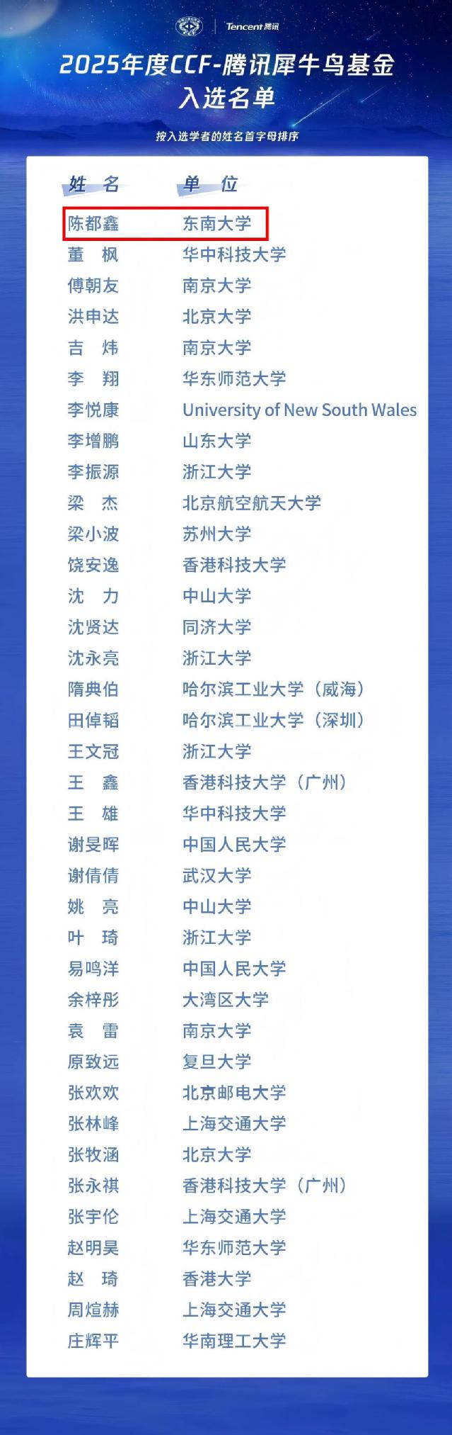 CCF-腾讯犀牛鸟基金(以下简称“犀牛鸟基金”)于2013年由CCF和腾讯公司共同发起,13年来,犀牛鸟基金致力于为海内外青年学者搭建产学合作创新的平台,推动科技在产业创新和社会发展中持续发挥价值。2025年度犀牛鸟基金于5月15日至6月15日开放申报,共收到来自130余所高校的390余份高质量申请。项目组特邀50余位学术界及腾讯技术专家组成评审委员会,基于科研能力、研究价值、学术创新性及方案可行性等维度进行评估,经过多轮严格评审,最终遴选出37位优秀学者。入选名单如下: