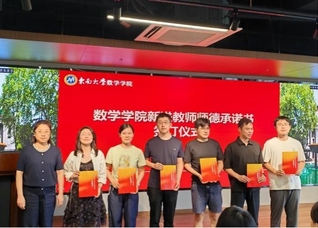 随后,刘娣、聂鑫、杨璐、杨立仁四位新教师依次登台进行自我介绍。新进教师在全院老师的见证下,签订了师德承诺书,并在虞文武院长的带领下庄严宣誓,表达了恪守师德、潜心育人、献身教育事业的信心与决心。
