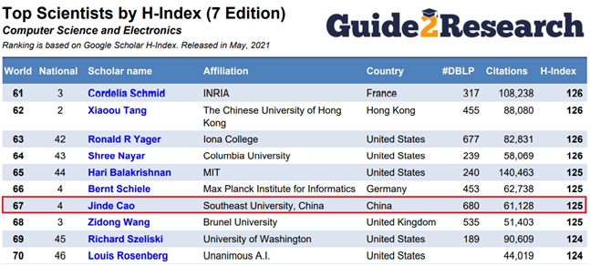 Guide2Research released recently the 7th Edition of 2021 Ranking of Top 1000 Scientists in the field of Computer Science and Electronics at www.guide2research.com/scientists, where Professor Jinde Cao ranked 67 in the world and 4 in China.